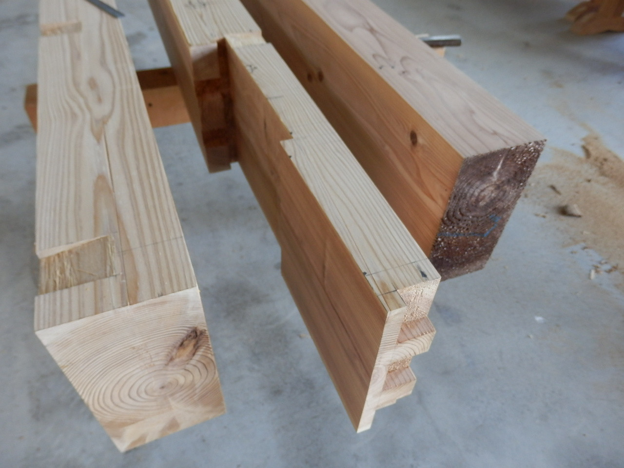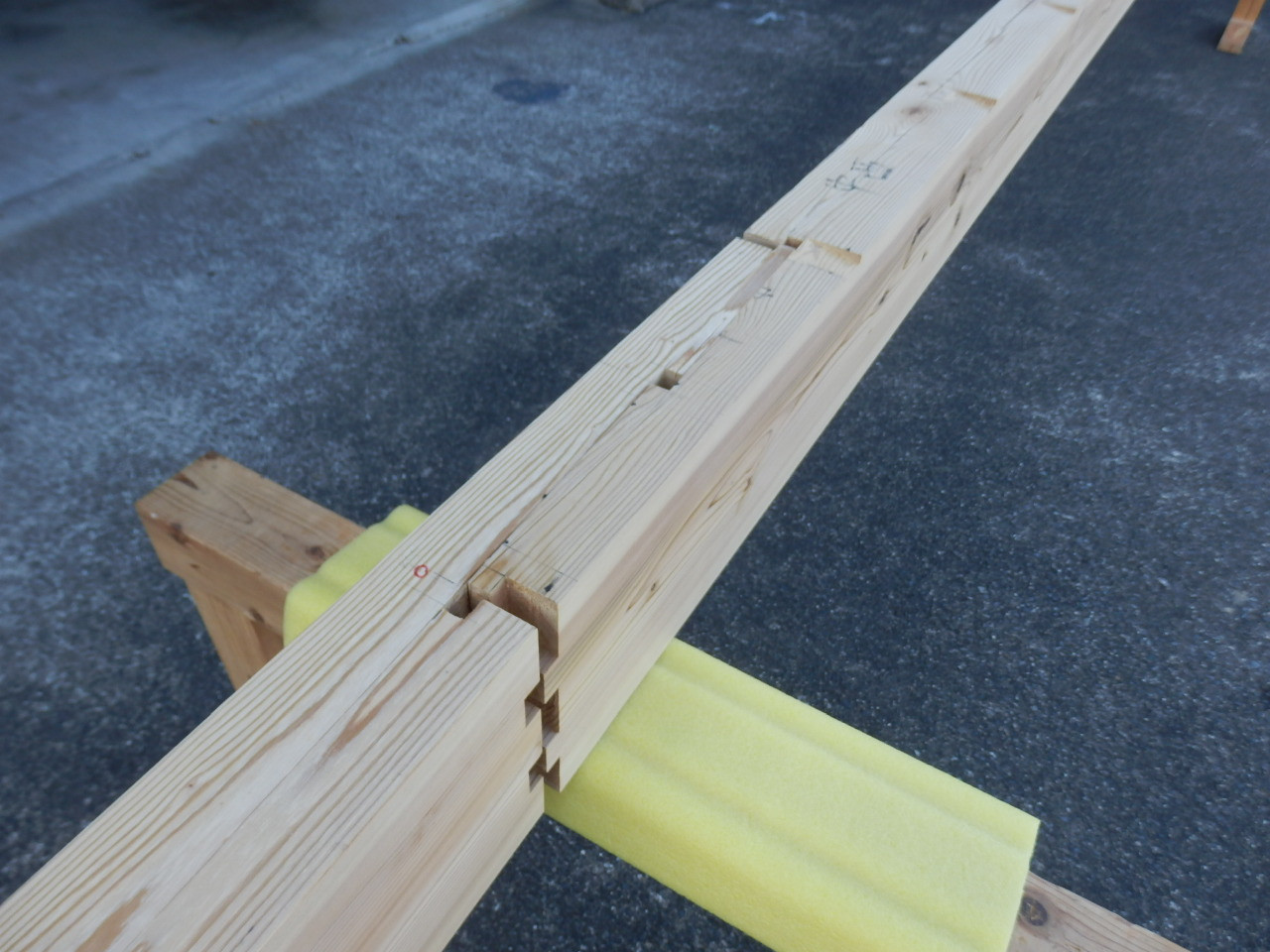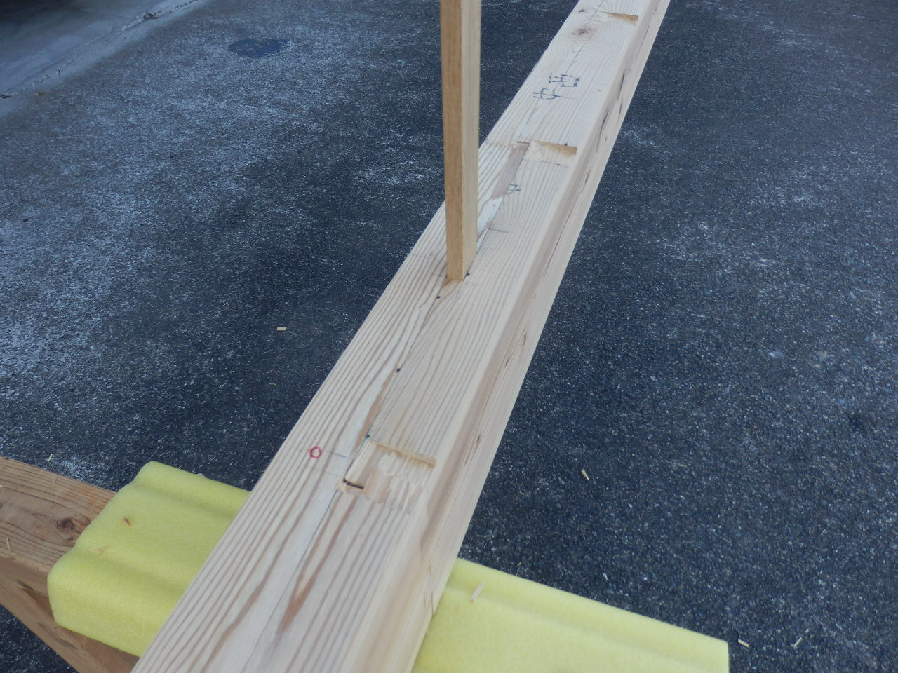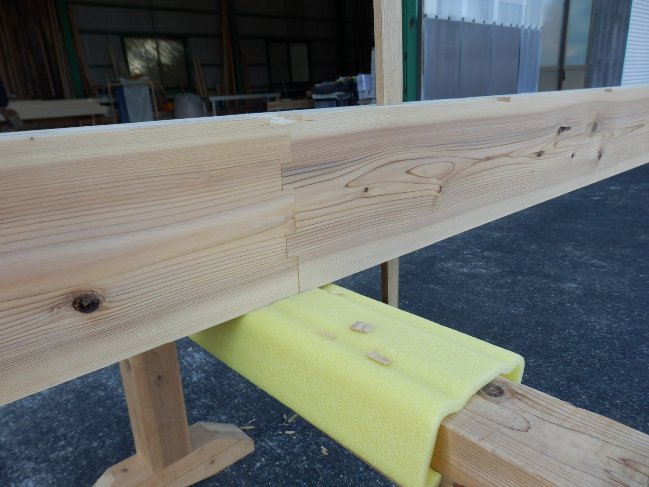 上の写真はその庇の桁となる材料を工場で切り出し、手加工したところです。