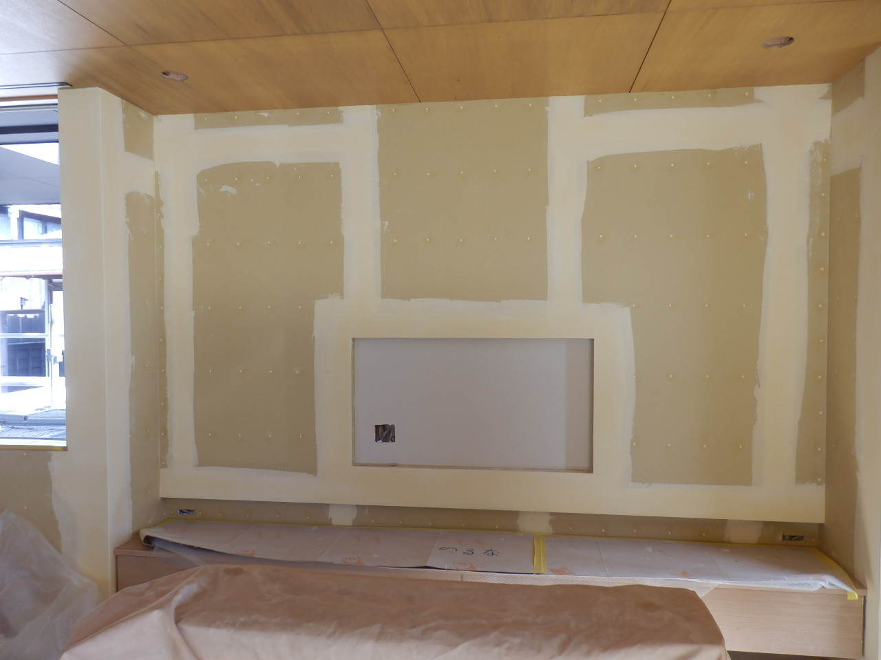 プラスターボードの1枚1枚のつなぎ目にこういったようにパテ処理をしています。