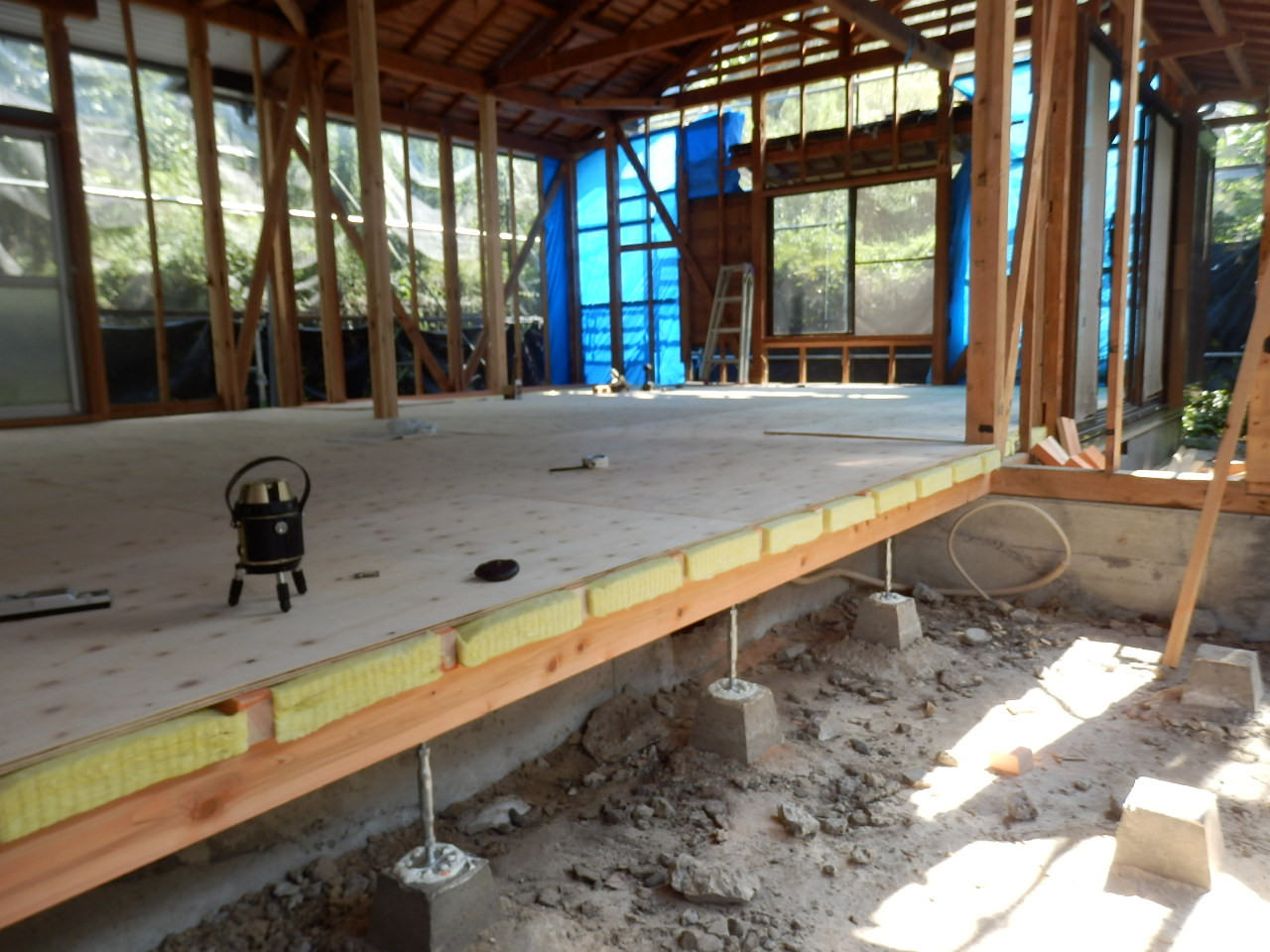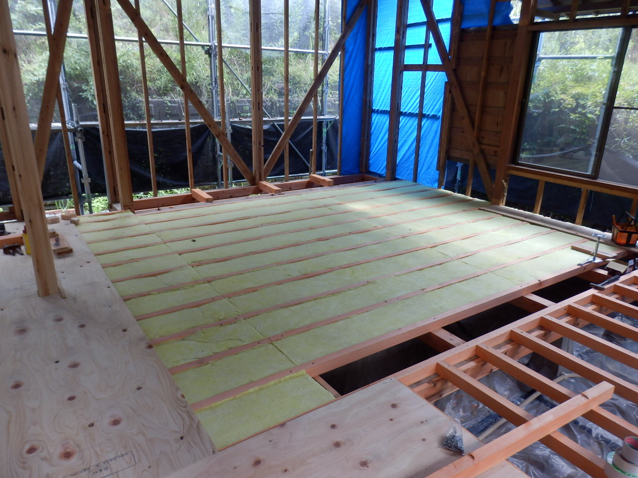 床断熱材を根太間に施工していきます。