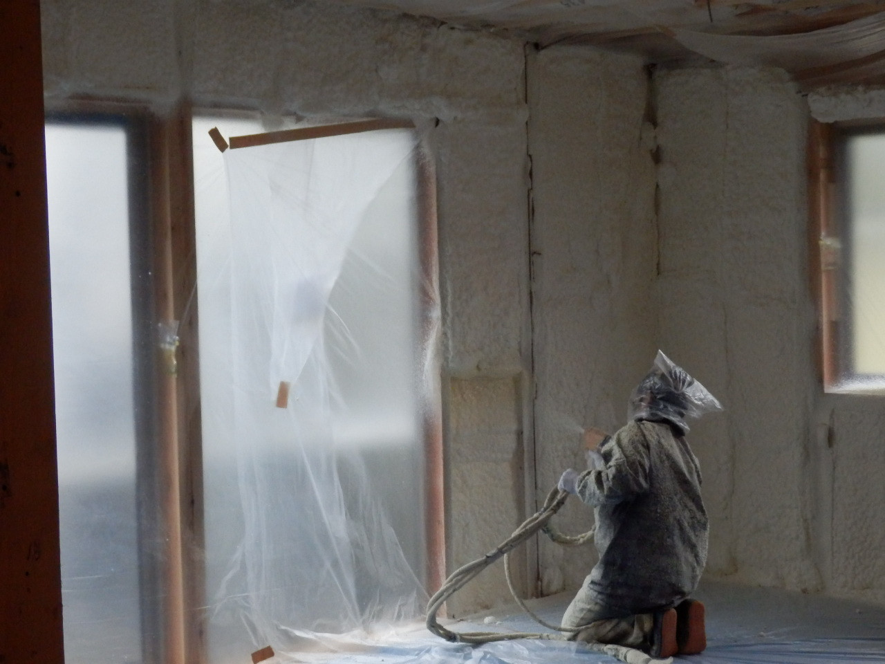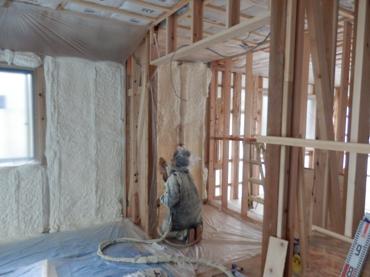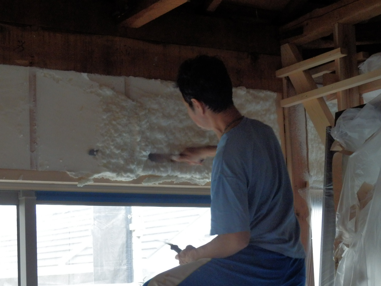 職人さんが持っている器具からスプレー状に噴射されているのがわかりますでしょうか?