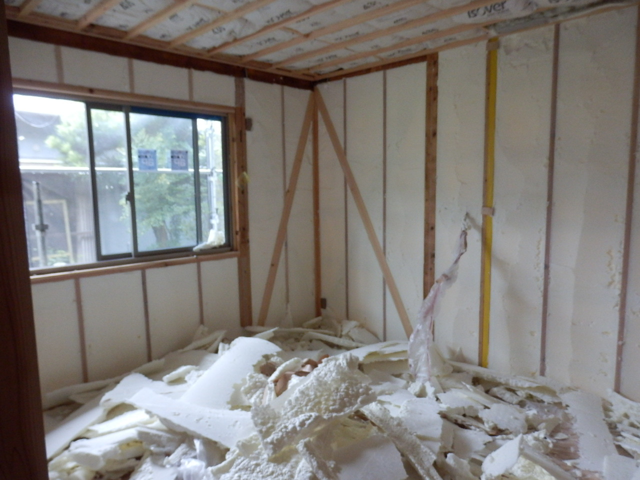 もこもこしていると壁胴縁がきれいに施工できなので、平にカットしていきます。