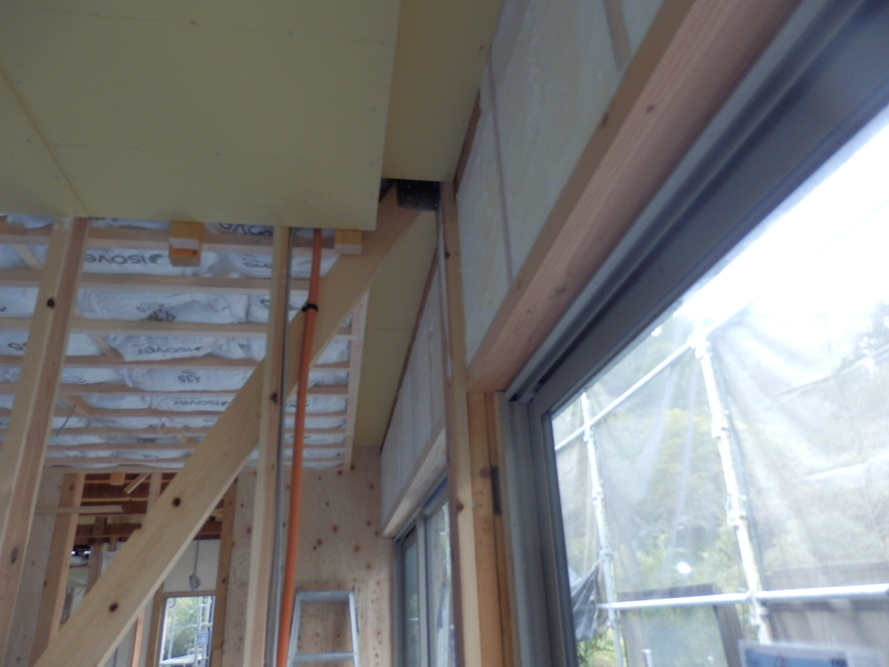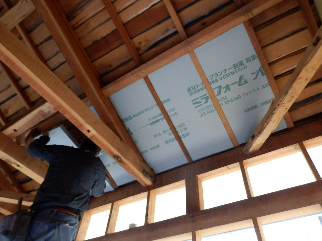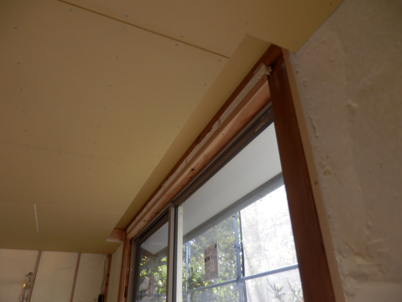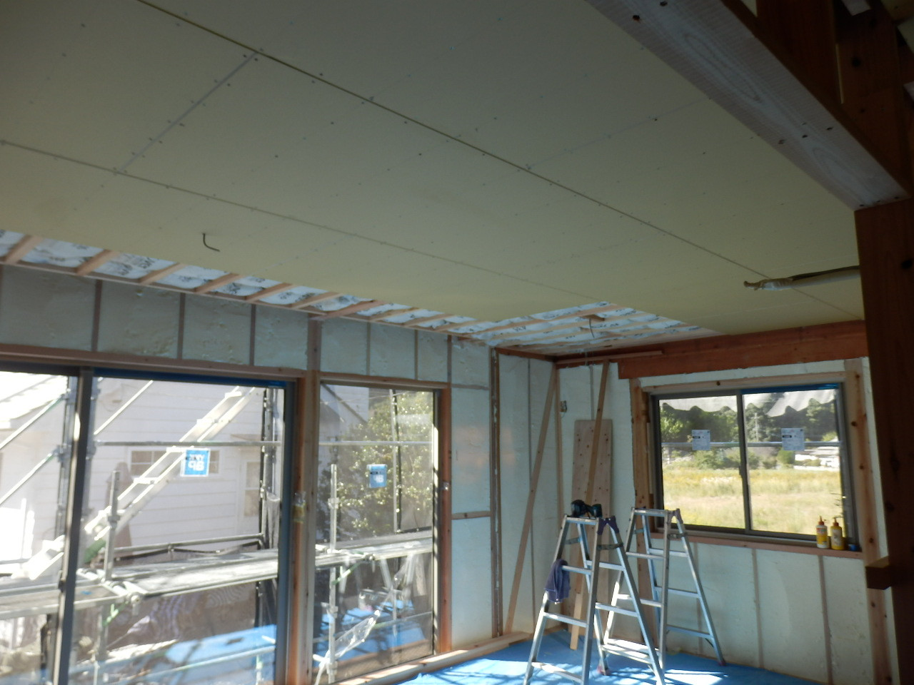 壁の吹付断熱材の施工が終わると、天井にプラスターボードを貼っていきます。