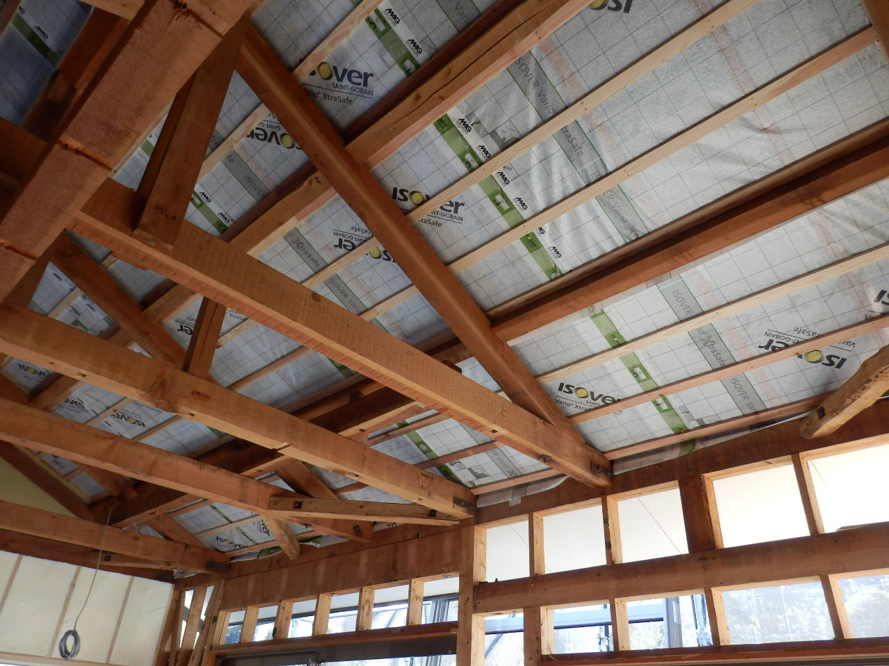 ↓天井に断熱材を施工してさらに透湿シートを貼り胴縁を施工した状態です。