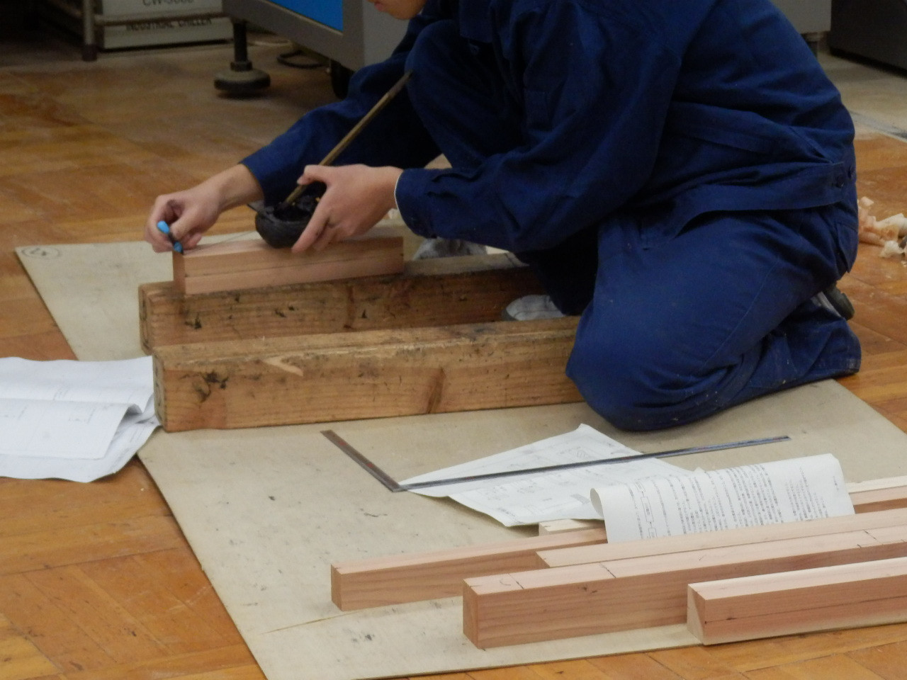 生徒さんの一人は墨出し時についた墨で手が真っ黒でした!