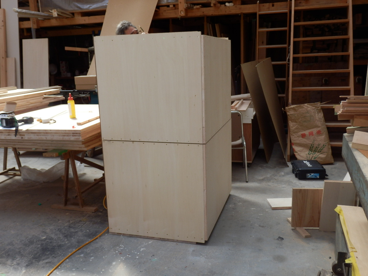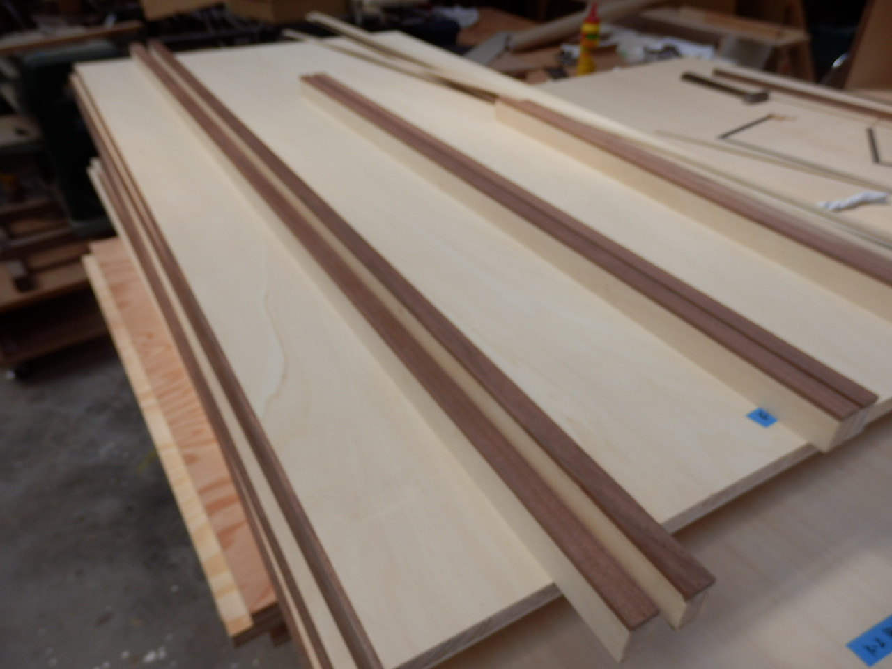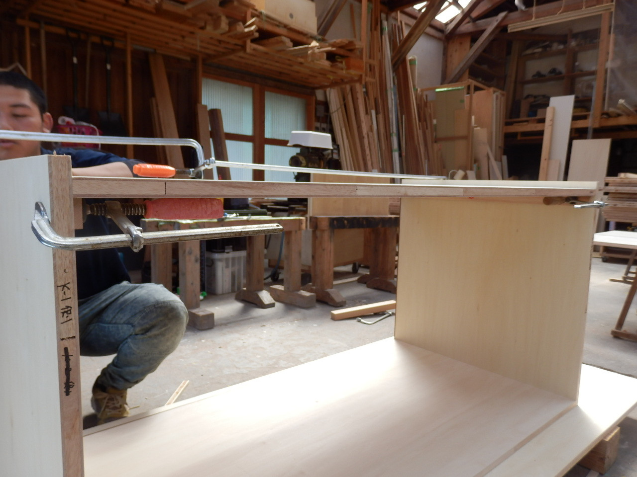 この材料も図面から出来上がり寸法をおって、化粧の小口にオーク材を取り付け切り出しています。
