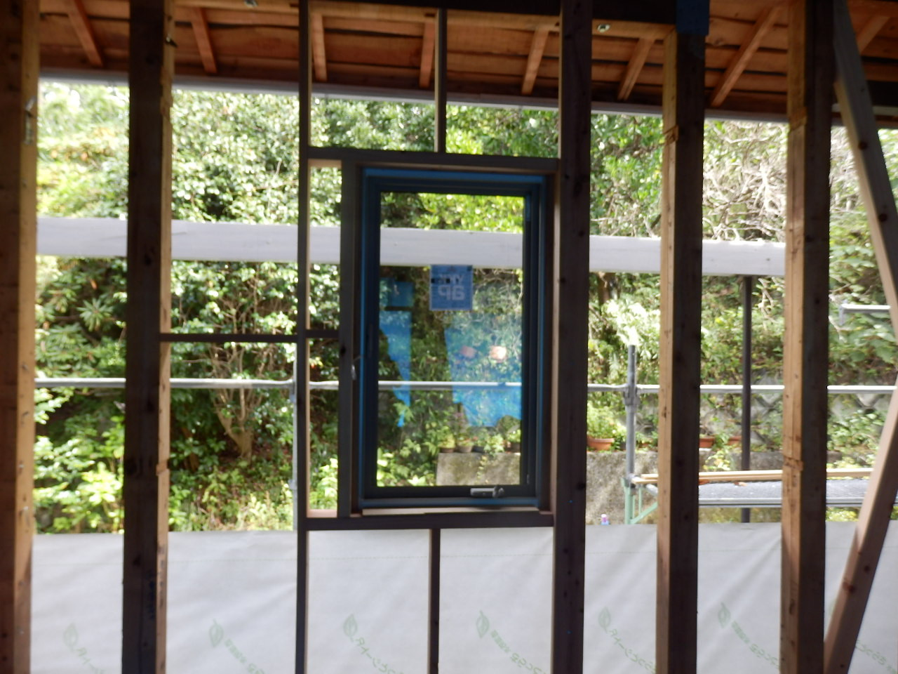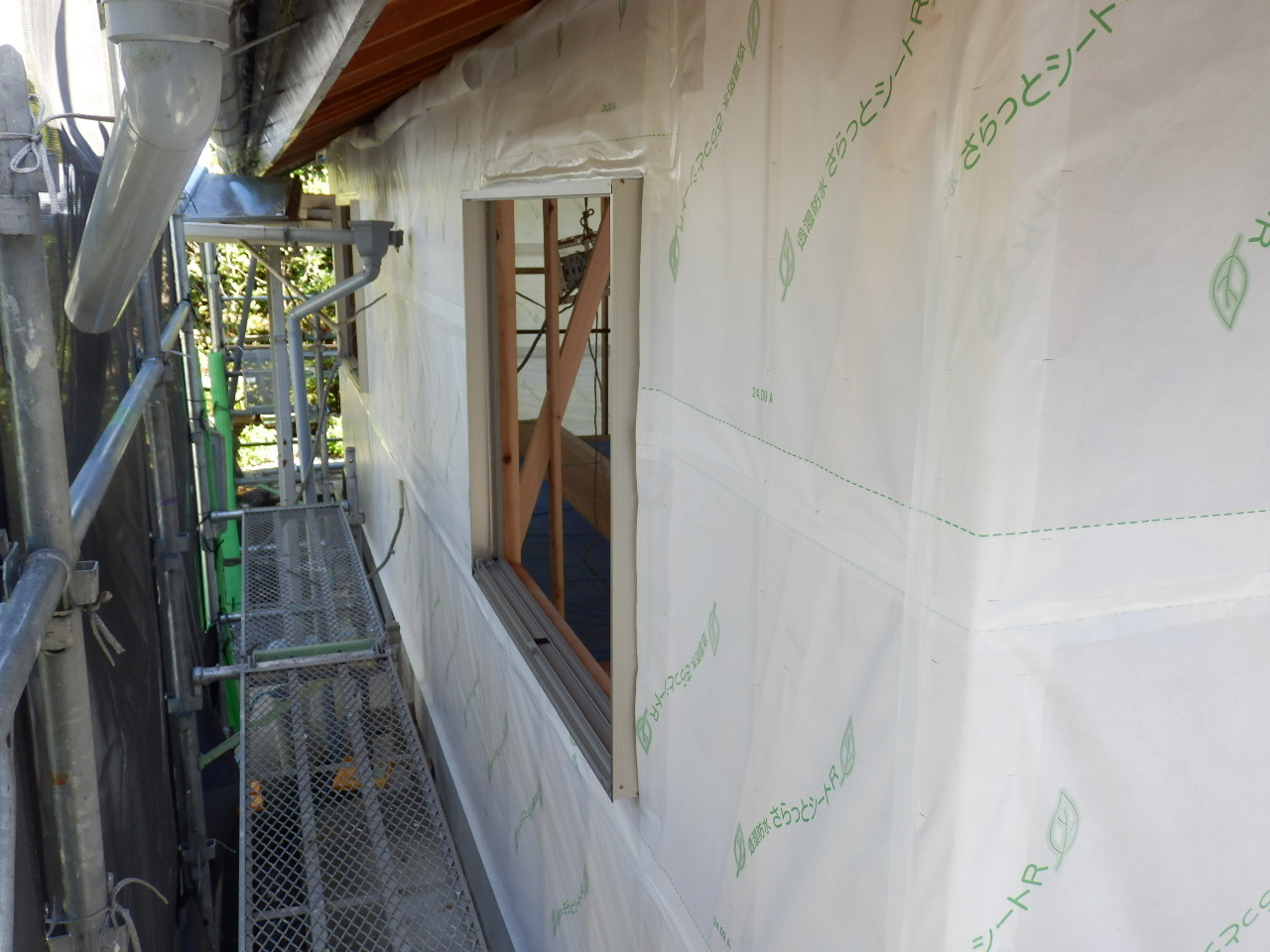 窓がはいると今度は、透湿シートを施工していきます。