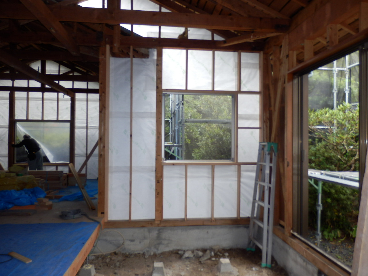 工事は新築時と同じように進んでいますが、既存の家屋に合わせて材料を切って施工していくので