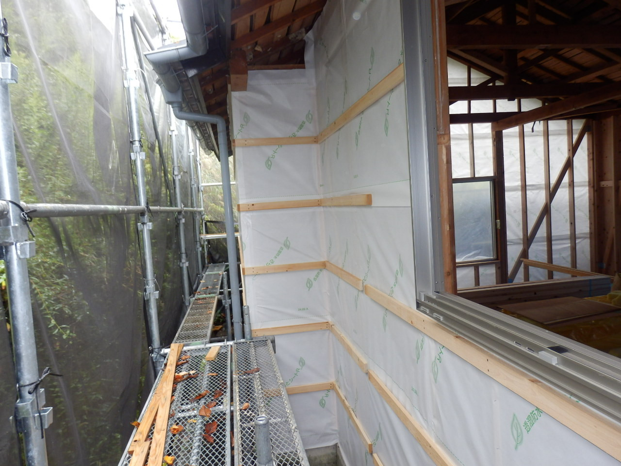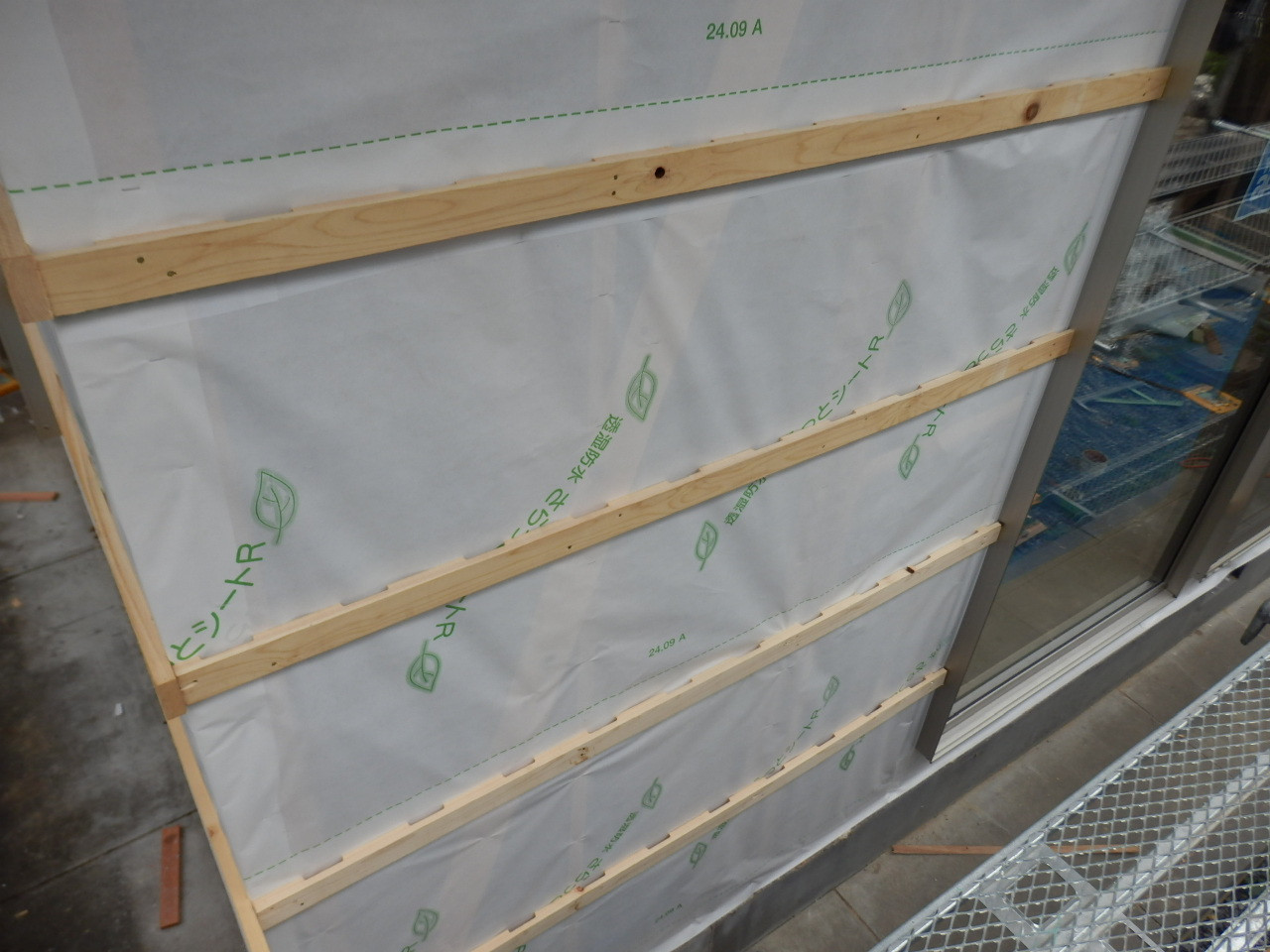 透湿シートを貼ったあと、外壁部分の下地施工になります。